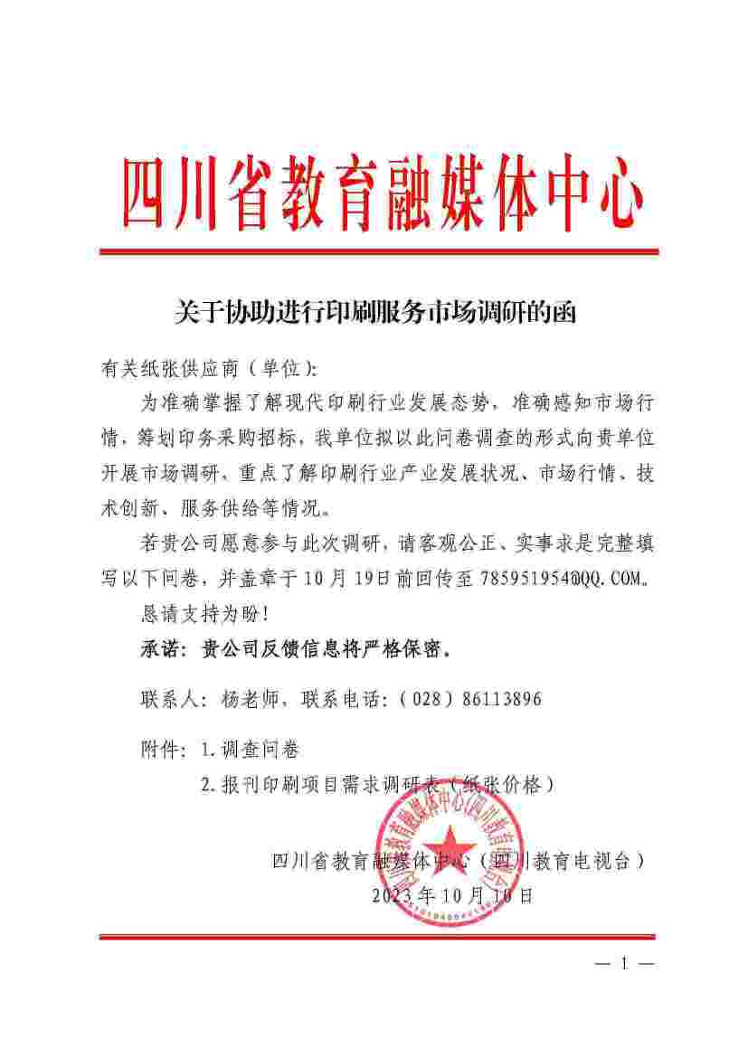 四川省教育融媒體中心關(guān)于協(xié)助進行印刷服務(wù)市場調(diào)研的函有關(guān)印務(wù)公司(單位):為準(zhǔn)確掌握了解現(xiàn)代印刷行業(yè)發(fā)展態(tài)勢,準(zhǔn)確感知市場行情,籌劃印務(wù)采購招標(biāo),我單位擬以此問卷調(diào)查的形式向貴單位開展市場調(diào)研,重點了解近年來印刷行業(yè)產(chǎn)業(yè)發(fā)展?fàn)顩r、市場行情、技術(shù)創(chuàng)新、服務(wù)供給等情況。若貴公司愿意參…...[閱讀全文]